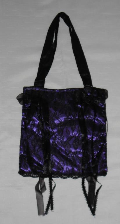 Black Lace, Purple Satin Lined Lolita Bag with Black Satin Roses & Ribbon under Satin Handles.
