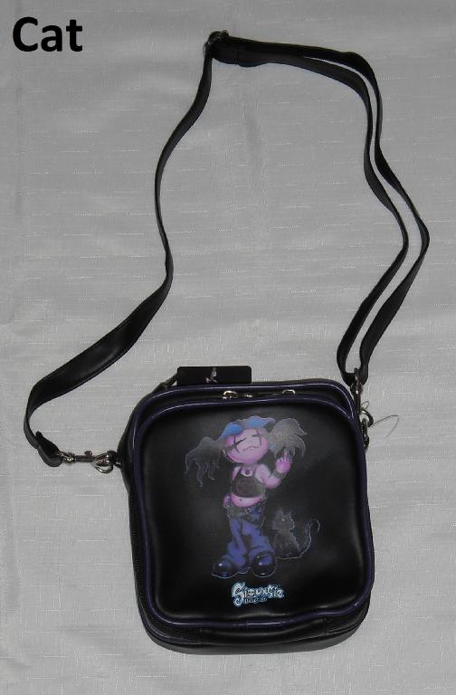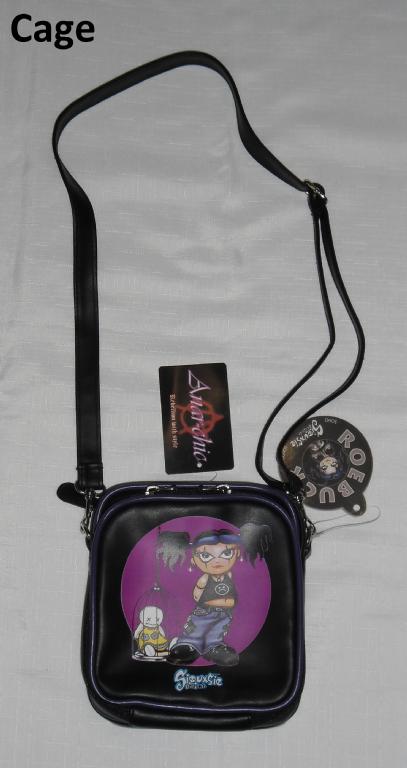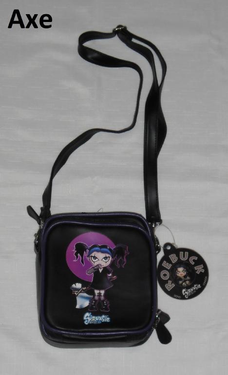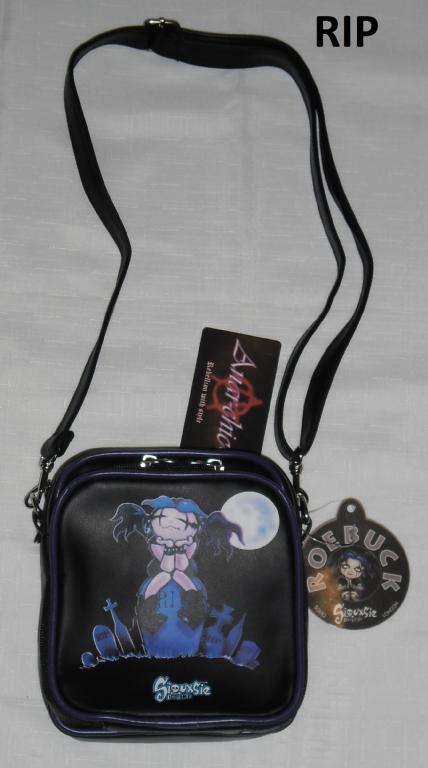 Darkside Siouxsie Compact Bag with shoulder strap, external zippered pocket and purple trim.
