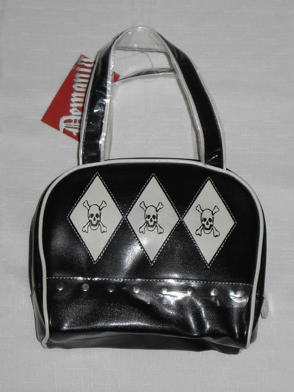 Black Bowling Bag with 3 White Inserts with Skull & Cross Bones, inside zippered pocket.