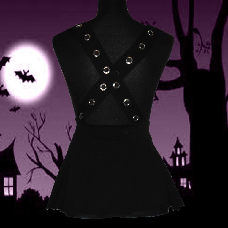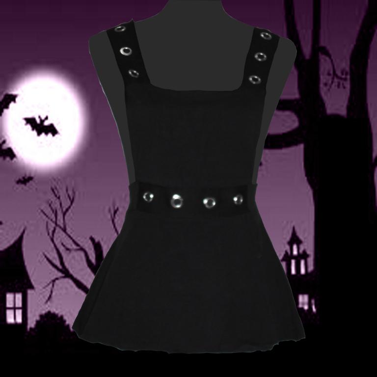 Folter, Black Tunic with Eyelet Shoulder Straps & Waist BandSizingMediumWaist = 34cm, Hips = 52cm, Skirt only full length = 28cmLargeWaist = 36cm, Hips = 54cm, Skirt only full length = 30cmAll measurements are approximate