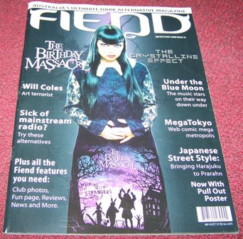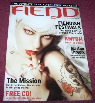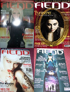 Fiend, The Ultimate Dark Alternative MagazineIssue 12Music Mayhem, Goth Down Under, Fiendish FashionIssue 14with Evanescence, Combichrist, Music of Razors, TriviumIssue 15Fiendish Festivals, KMFDM & MzAnn ThropikIssue 16The Birthday Massacre