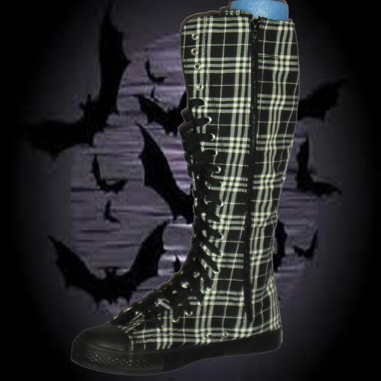 Knee-Hi Black/White Tartan Boots Lace-up Front with Side Zip