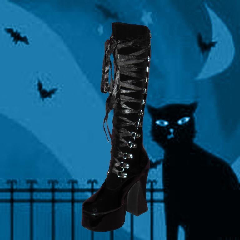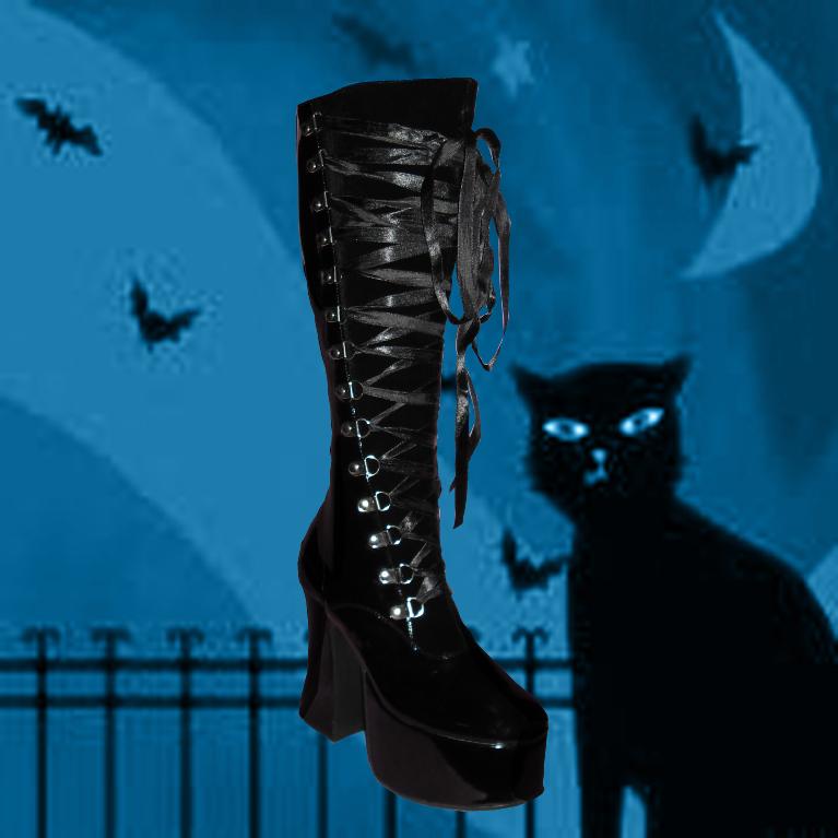 Slush-219, 4¾” Corset Front Platform Black Pat/Suede Knee Boot complete with Black and Red Laces