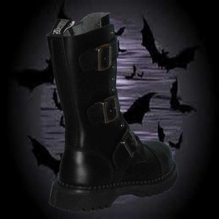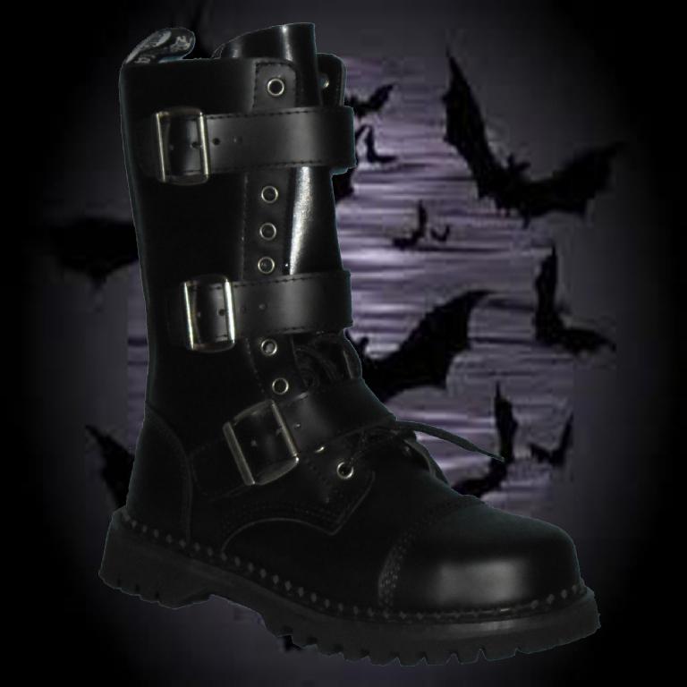 Riot-12, 12 Eyelet 3 Strap Steel Toe Black Leather Calf Boot