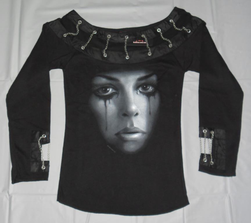 Black Tears, Long Sleeve with Chain Triming around Neck Line and Sleeves Sizing Medium Bust = 37cm, Waist = 35cm, Hips = 36, Inside Sleeve = 49, Full Length = 59cm Large Bust = 39cm, Waist = 36cm, Hips = 37, Inside Sleeve = 49, Full Length = 63cm All measurements are approximate