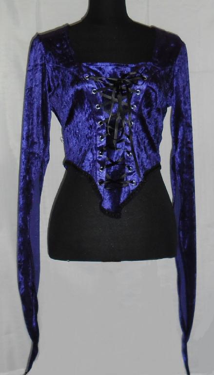 Laughing Vampire, Helen, Purple Velvet Long Sleeve Top with Front Lace-UpSizingMed/LrgBust = 49cm, Waist = 43cm, Inside Sleeve = 19cm, Full Length = 44cmAll measurements are approximate